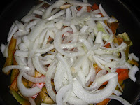 Cando o pemento abrande un pouco, engadimos a cebola. Botamos un chisco de sal para que se cociñen antes.